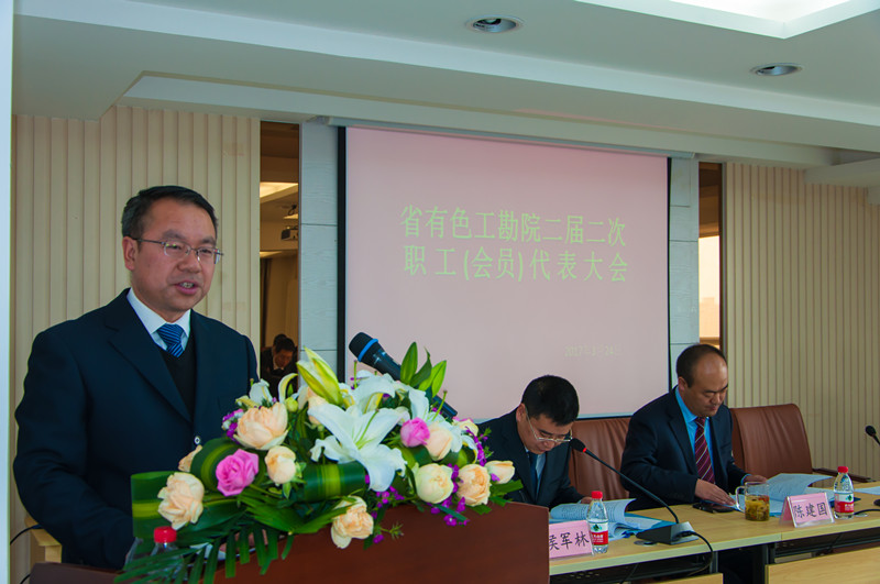 随后,会议在庄严的国歌声中正式拉开序幕。院长陈建国作《凝心聚力、勇于担当,为实现全院地勘经济健康发展而努力奋斗》的行政工作报告。报告从生产经营、管理水平、党建工作、队伍建设等方面,对2016年我院各项工作进行全面的梳理与总结,在总结过去一年成果的同时,分析并指出了当前发展面临的困难与问题,研判形势,部署2017年和今后一个时期的工作,统一思想,凝聚共识。